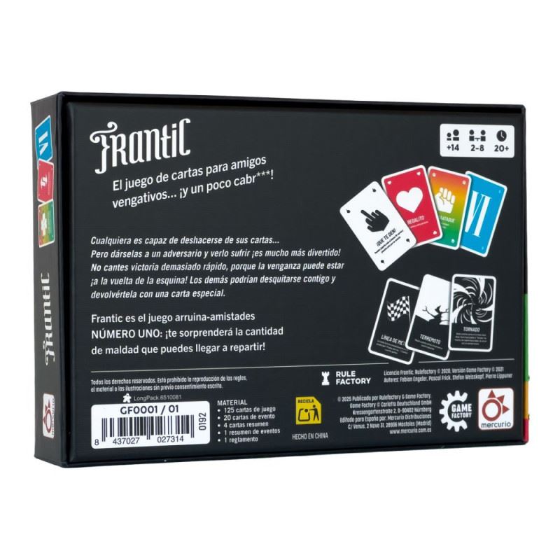 el juego de cartas para amigos vengativos. frantic se basa en la mecánica del juego del uno. todo el mundo es capaz de deshacerse de sus cartas, ¡pero dárselas a un adversario y verle sufrir es mucho más divertido! pero no cantes victoria demasiado pronto, la venganza está a la vuelta de la esquina. otros pueden desquitarse contigo, o anular el resultado con una carta de evento. frantic es el juego número uno que arruina amistades ¡te sorprenderá lo malvado que puedes llegar a ser!