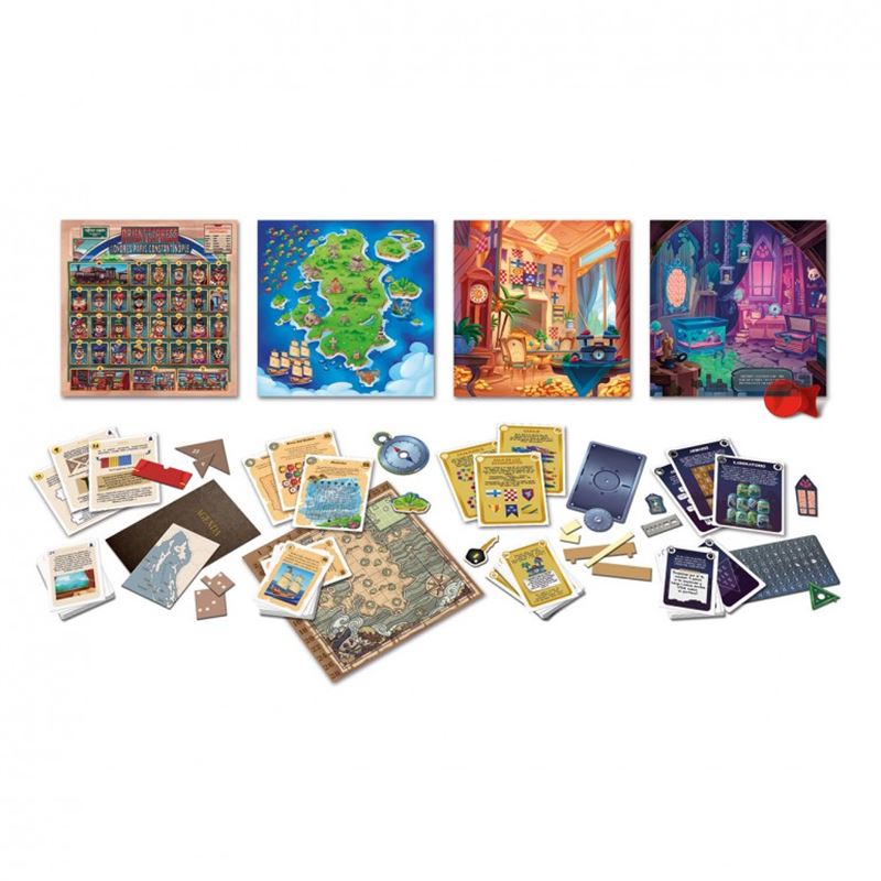cada aventura está asociada a una baraja de cartas con acertijos, un tablero con el entorno y objetos misteriosos que ayudarán a los jugadores a avanzar en el juego.