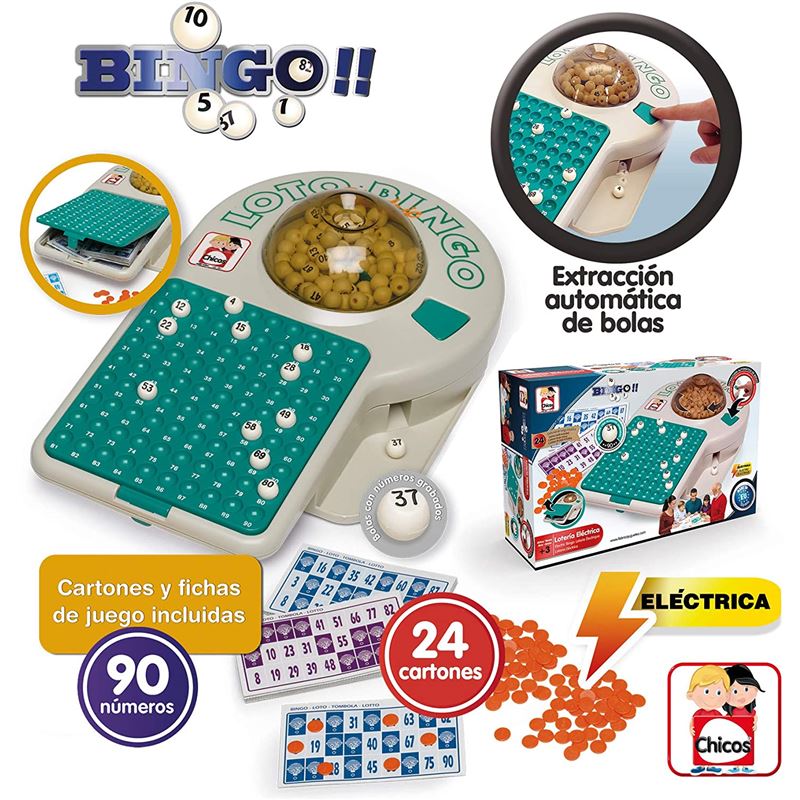 nuevo pack de loteria eléctrica, con fichas de juego incluidas, 90 bolas con números grabados, 24 cartones de juego incluidas. extracción automática de bolas.