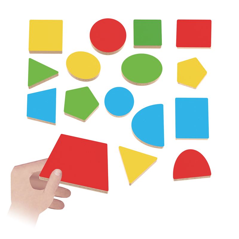 contenido: 16 formas de madera, 5 plantillas de formas, 6 puzzles, 20 formas de cartón y 1 base de apoyo.
