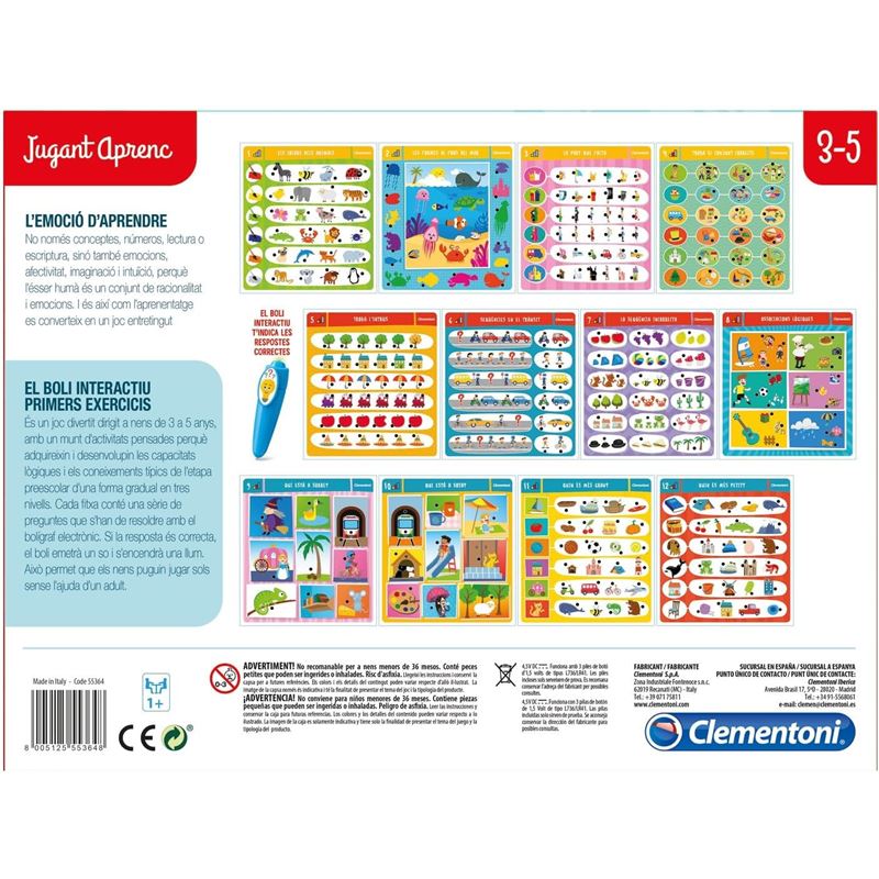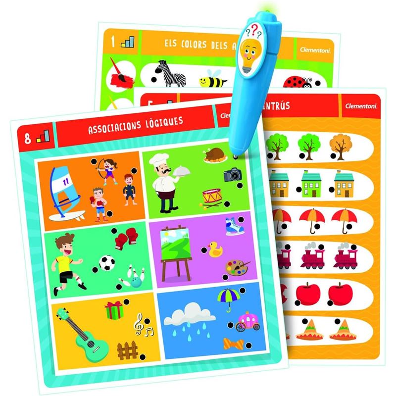 Incluye 6 tarjetas con 12 actividades educativas y más de 100 preguntas para resolver, utilizando el bolígrafo electrónico que habla en catalán.