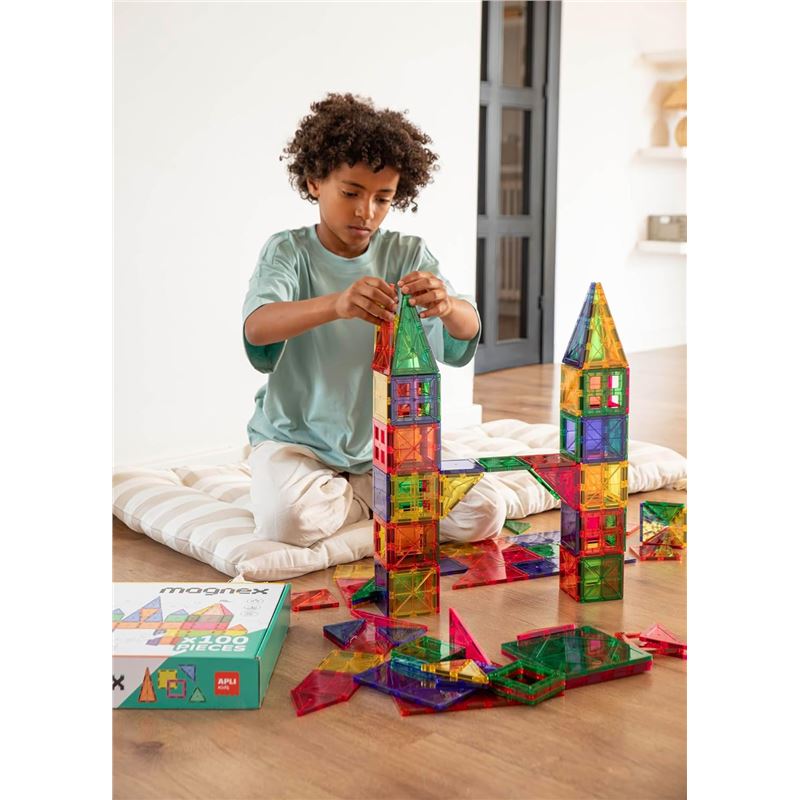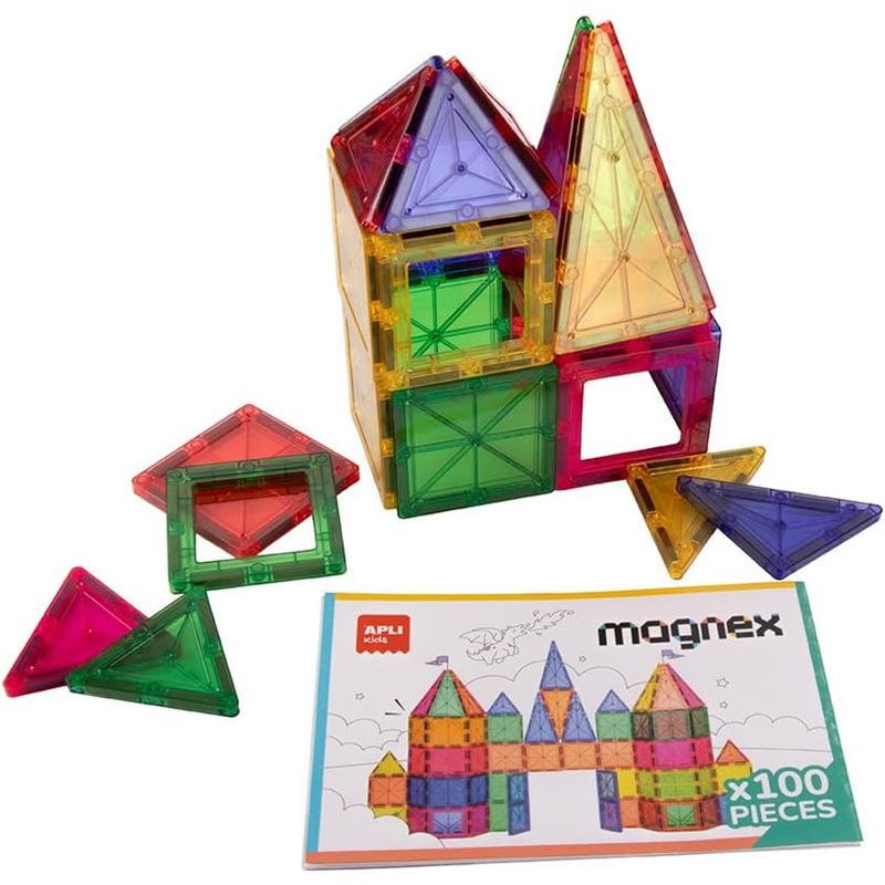 Set de piezas magnéticas 3d: contiene 100 formas geométricas imantadas de diferentes tamaños y colores, ideales para crear construcciones creativas y estructuradas. incluye guía ilustrada con modelos de ejemplo. las instrucciones ayudan a inspirar nuevas construcciones y fomentan el juego autónomo y exploratorio.