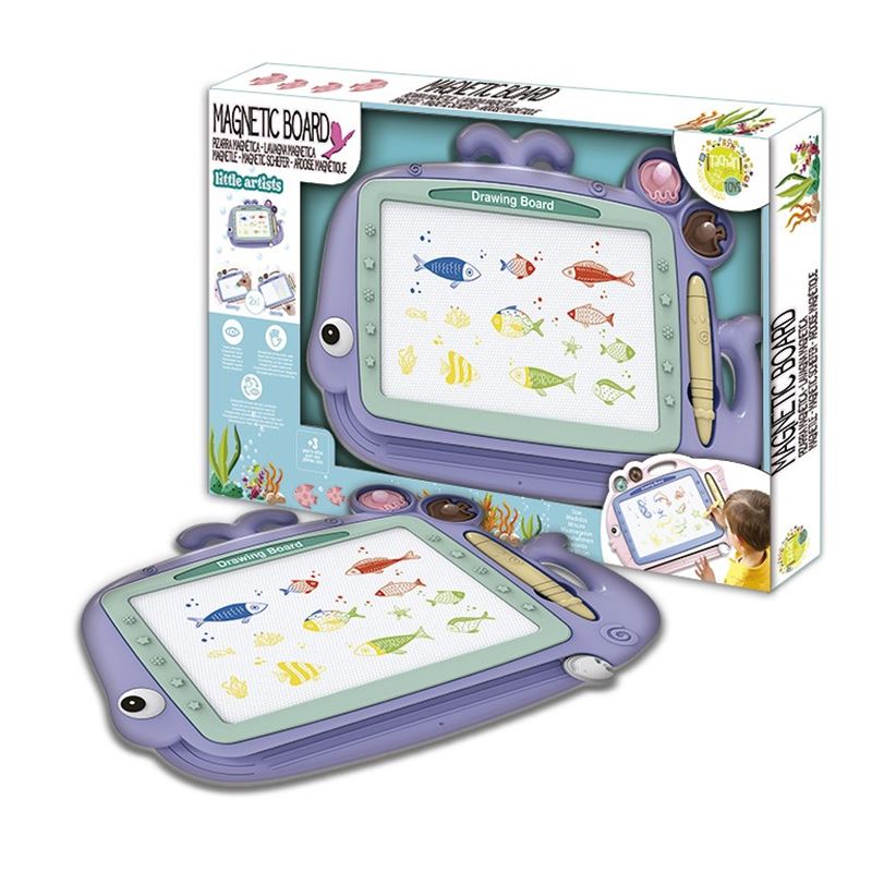 Pizarra magnética a todo color con forma de pez de color azul. incluye piezas con formas para estampar lapicero y láminas para dibujar. borrado automático.