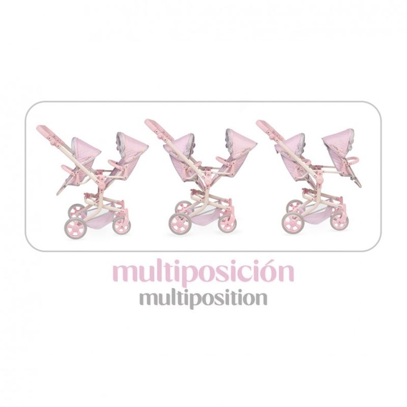 Descubre el carrito gemelar más alto del mercado, el manillar se encuentr a a casi un metro de altura, con estructura plegables y sillas multiposición. diseñado en color rosa con detalles grises, manillar con altura ajustable, bolso a juego con asas de madera natural, bandeja portaobjetos de tela y muchos más detalles de lujo. para muñecas de hasta 52 cm.