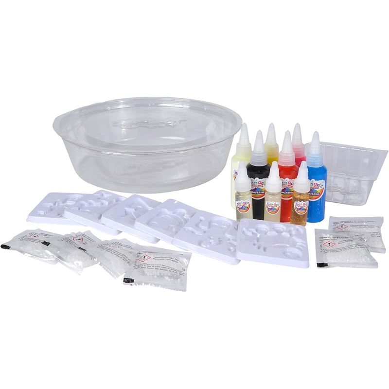 amplio contenido: el set incluye 9 botellas de gel de color con colores básicos, colores con purpurina y colores con efecto de brillo en la oscuridad, así como un bol, 6 moldes y 6 sobres de mezcla para el agua