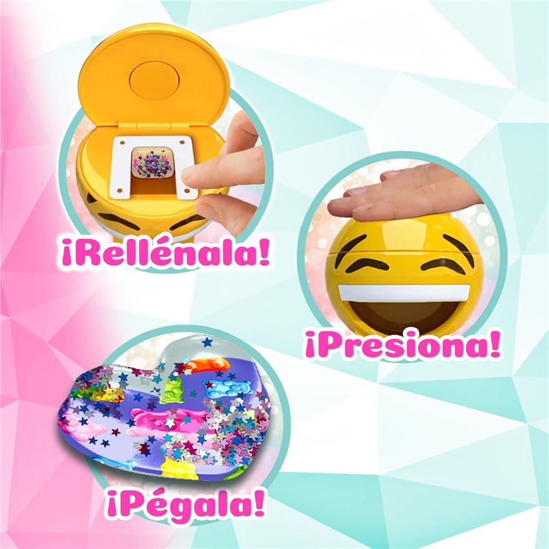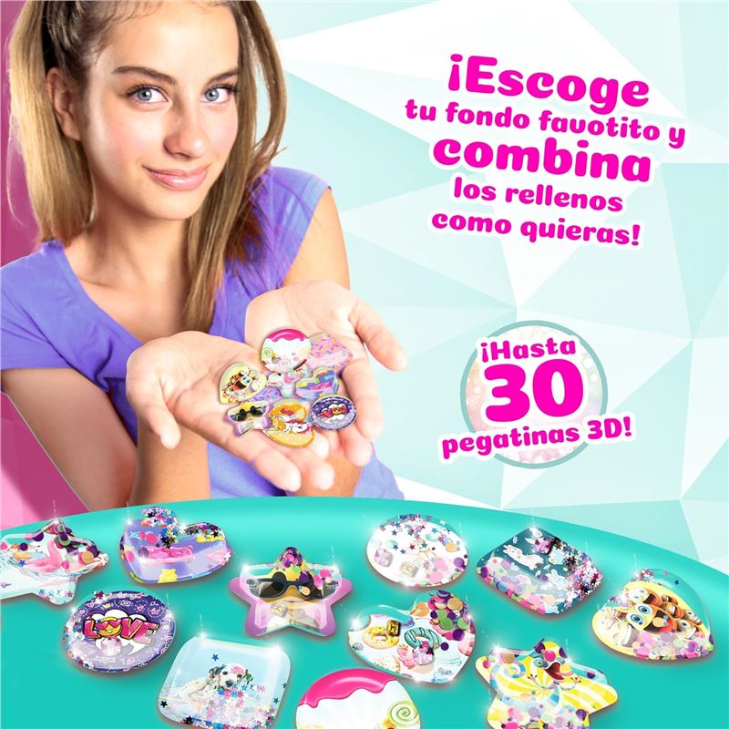 incluye 1 máquina para hacer pegatinas, 30 blisters de pegatinas, 30 fondos, 30 bases, 1 bolsa de virutas, 2 bolsas purpurina y 250 gemas.