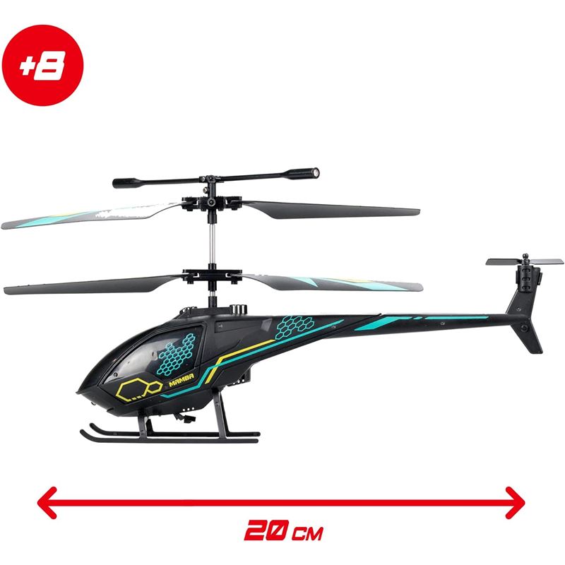 Fantástico helicóptero infrarrojo de 2 canales de gran precisión y fácil manejo. está equipado con luces led, lo que permite un despegue luminoso cuando el helicóptero se está elevando en el cielo. el control de la transmisión ir y su preciso control de velocidad le permiten una excelente estabilidad de vuelo. para uso solo en interiores y decorado con unos gráficos que simulan la piel de una serpiente, la mamba negra.