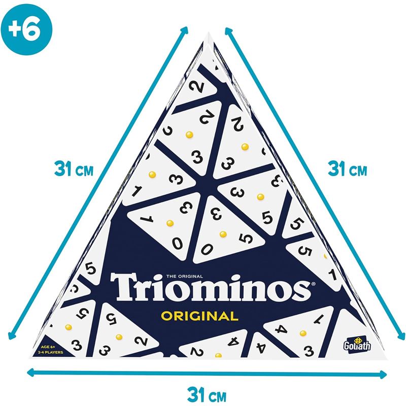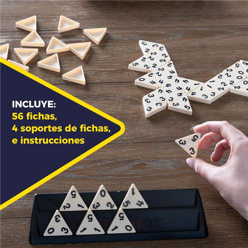 ¡la variación más fascinante del famoso juego del dominó! haz que coincidan los números de los lados de cada triángulo y si completas figuras geométricas podrás ganar puntos extra. con reglas muy sencillas y un sinfín de posibilidades. un clásico juego de estrategia que desarrolla la atención, el cálculo, el razonamiento y la visión espacial. un juego que incluye emoción, suerte y diversión para disfrutar en familia o con amigos. incluye: 56 fichas triominos, 4 soportes de fichas y reglas de juego.