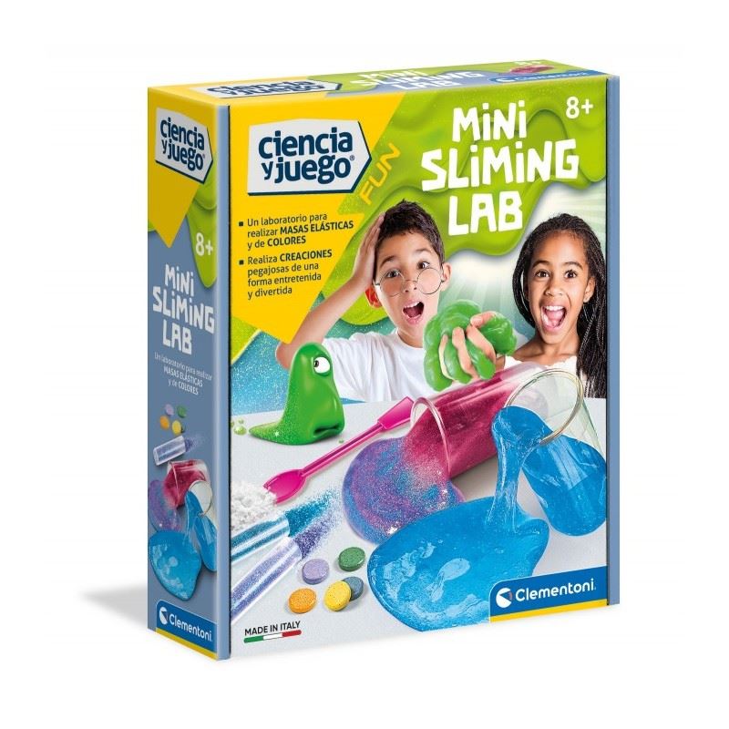 Mini sliming lab. fluorescente de clementoni. es un increible laboratorio científico con muchos experimentos interesantes y divertidos para descubrir los secretos de la química y los fluidos viscosos. este kit contiene pegamento con base acuosa, una solución activadora y muchos colorantes para crear increibles fluidos. usando el matraz y la espátula incluidos en el kit es fácil llevar a cabo estos sencillos y divertidos experimentos. con guia paso a paso.