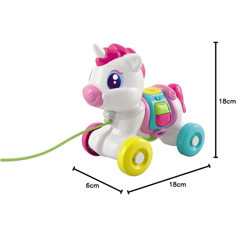 • gracias a los botones interactivos, las ruedas y la cuerda, el unicornio favorece el desarrollo sensorial y motor.