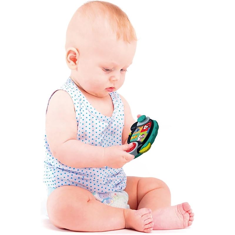 el botón y la palanca interactivos y la rueda mecánica ayudan a ejercitar la motricidad fina.