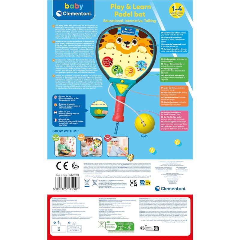 Raqueta interactiva para bebés: la pala baby padel de clementoni, diseñada para niños a partir de 12 meses, ofrece un agarre fácil con mango antideslizante, contorno suave y superficie interactiva para un juego seguro y desafiante.