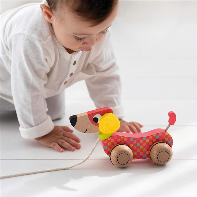 Divertido perrito arrastre de madera. al tirar de la cuerda, el perrito avanza graciosamente moviendo la cabeza y la cola, estimulando al bebé seguir tirando. acompaña y estimula los primeros pasos del bebé.