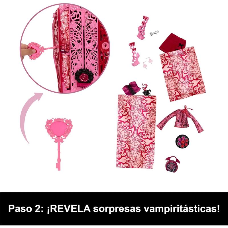 inserta el talismán en la base del armario y luego deslízalo como una cremallera para revelar la muñeca draculaura en todo su vampirástico esplendor; repite la revelación una y otra vez para divertirte sin parar