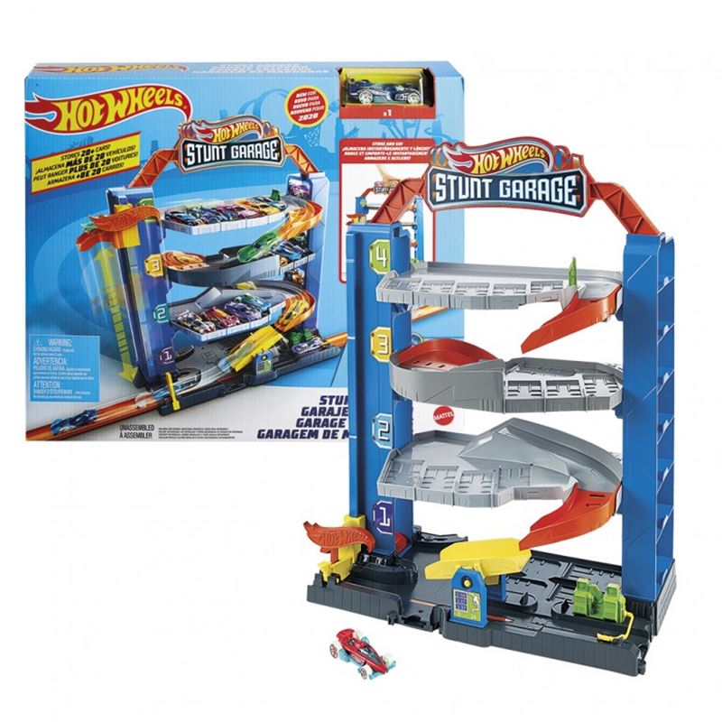 ¡el hot wheels city stunt garage es el único garaje que permite que los coches de los niños salten de un piso a otro! utilice el ascensor para llevar los coches a cualquier nivel y decida aparcar el coche allí o hacer acrobacias, saltando al piso inferior. los niños pueden usar las palancas de cambio para guiar su automóvil a un nivel específico, o pueden ir al piso principal para una revisión total del automóvil. ¡recarga combustible y asegúrate de que el auto esté listo para la próxima aventura! cada conjunto se conecta directamente a otros conjuntos de hot wheels city y a la pista gris de city; sigue siendo compatible con su pista naranja.