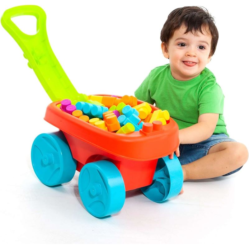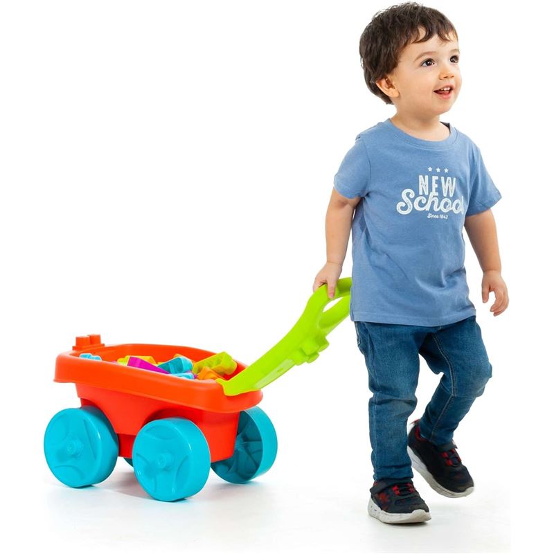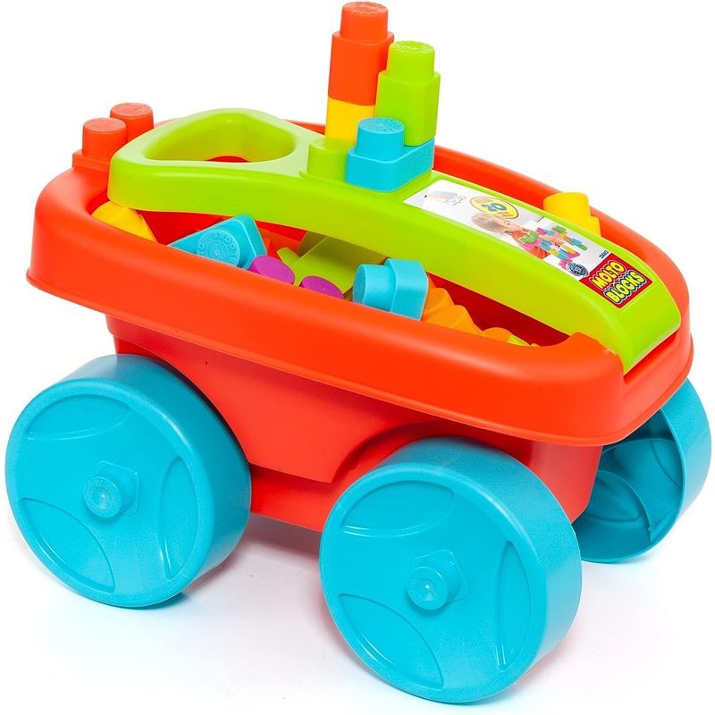Vagón bloques carrito con bloques molto de color rojo, con 20 bloques que se adaptan perfectamente a la mano del bebé, mejorando la motricidad fina y la estimulación temprana del bebé.