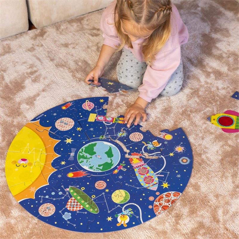 Puzle circular de piezas gigantes para introducir a los niños en las maravillas del espacio. un puzle reversible con dos escenas: escena de día con planetas y cohetes y escena de noche con constelaciones. además, ¡la escena de noche brilla en la oscuridad!